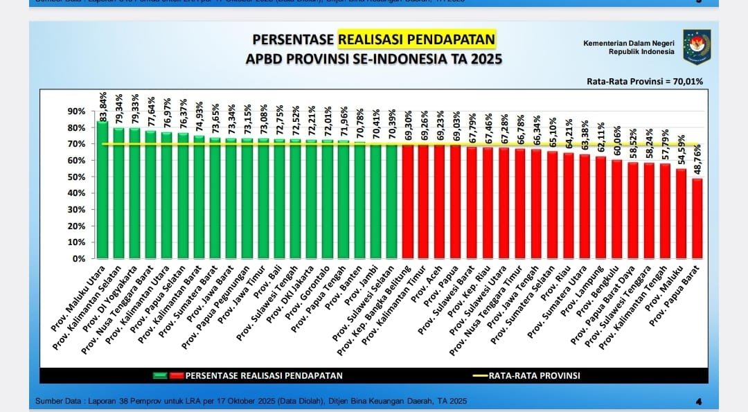 Berdasarkan data yang dirilis oleh Direktorat Jenderal Bina Keuangan Daerah Kemendagri per 17 Oktober 2025, secara nasional, rata-rata realisasi pendapatan APBD provinsi di seluruh Indonesia mencapai 70,01 persen, sedangkan rata-rata realisasi belanja sebesar 55,59 persen.