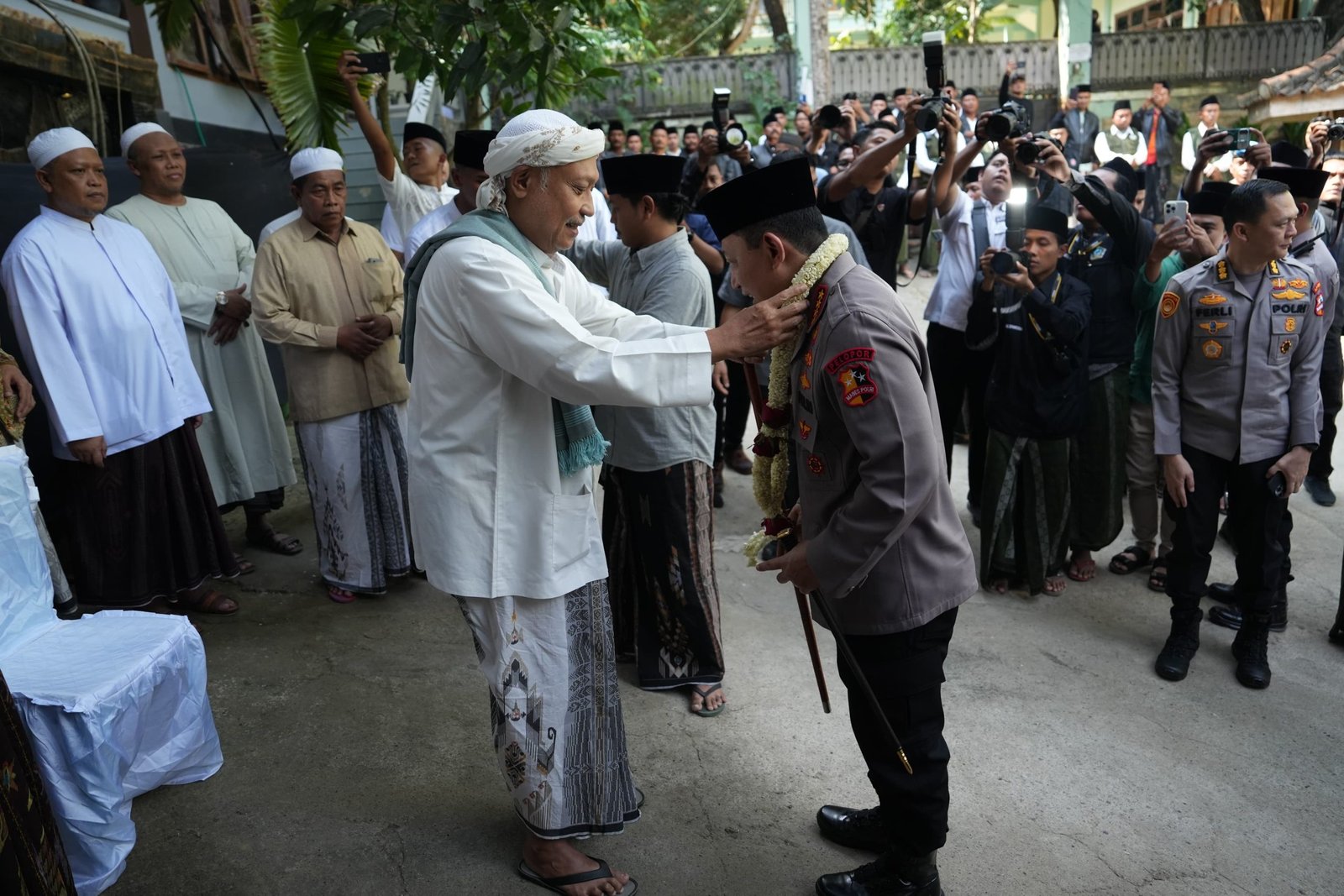 Kedatangannya disambut meriah oleh Pengasuh Ponpes Al-Hamidy Banyuanyar, RKH Mohammad Rofi’i Baidhowi, yang mengalungkan bunga tanda penghormatan. Suasana semakin khidmat dengan penyerahan tali asih simbolis kepada salah satu santri dan pemberian plakat kepada Kyai Rofi’i oleh Kapolri.