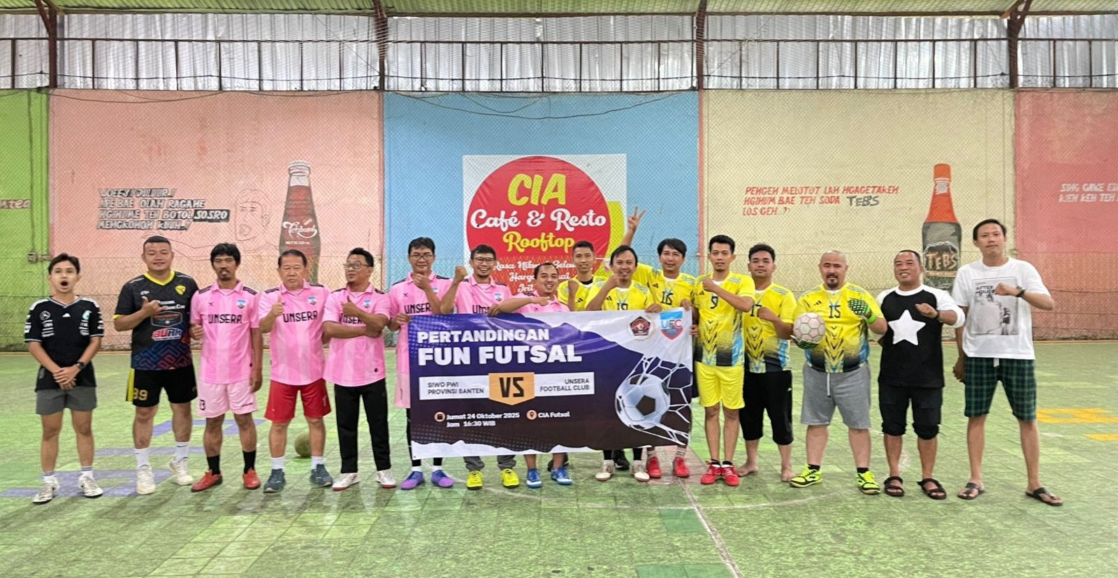 SERANG – Lapangan CIA Futsal, Kota Serang, pada Jumat sore (24/10/2025) menjadi saksi bisu pertandingan persahabatan yang penuh semangat dan keceriaan antara tim futsal SIWO PWI Banten dan UNSERA FC. Laga yang berlangsung dari pukul 16.00 hingga 18.00 WIB ini bukan hanya sekadar adu taktik dan strategi di lapangan, tetapi juga menjadi ajang silaturahmi yang efektif untuk mempererat hubungan antara insan pers dan kalangan olahraga di Provinsi Banten.