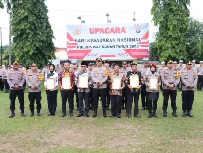 WAY KANAN – Polres Way kanan menggelar Upacara Hari Kesadaran Nasional (HKN) dan pemberian penghargaan terhadap personel Kepolisian, tokoh masyarakat dan Tokoh adat Kabupaten Way Kanan di lapangan Mako Polres Way Kanan. Senin (17/02/2025).