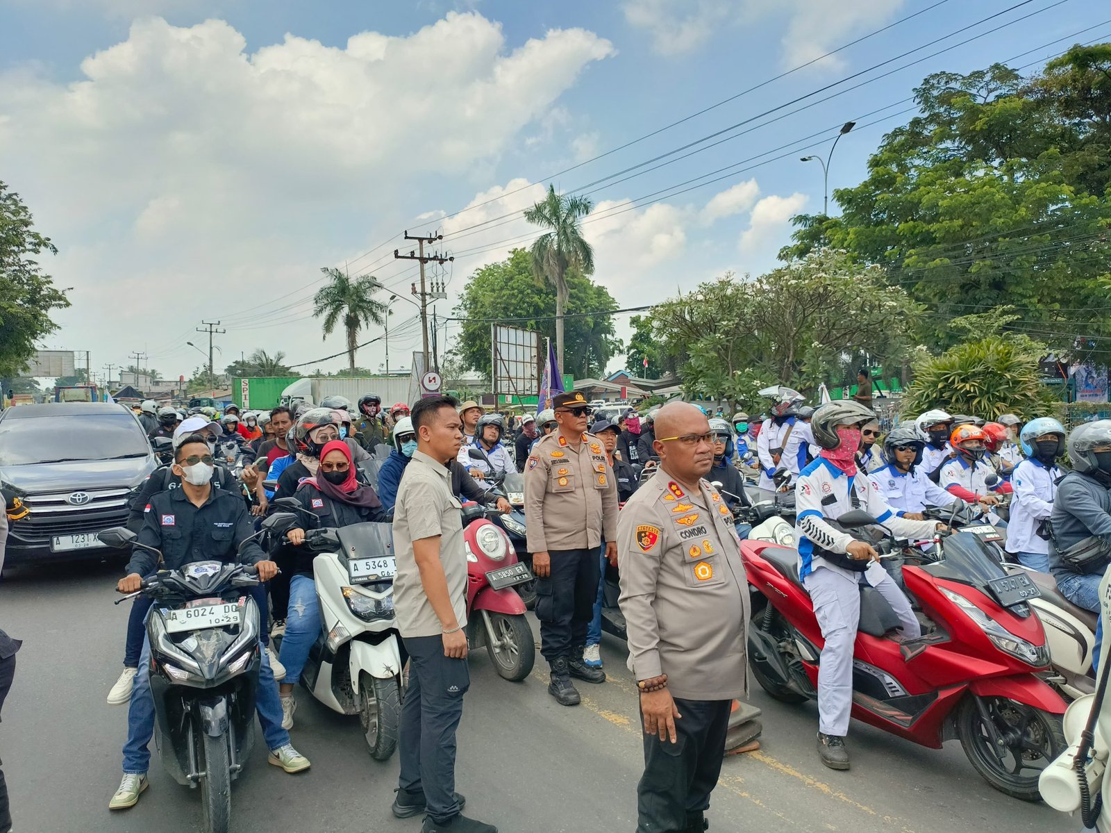 SERANG – Kapolres Serang, AKBP Condro Sasongko, turun langsung menemui massa buruh dari berbagai Serikat Pekerja yang akan menggelar aksi unjuk rasa di Kantor Gubernur Banten. Pertemuan ini dilakukan di gerbang Kawasan Industri Modern Cikande, Kabupaten Serang, sebelum massa bergerak menuju Kawasan Pusat Pemerintahan Provinsi Banten (KP3B) di Kota Serang.