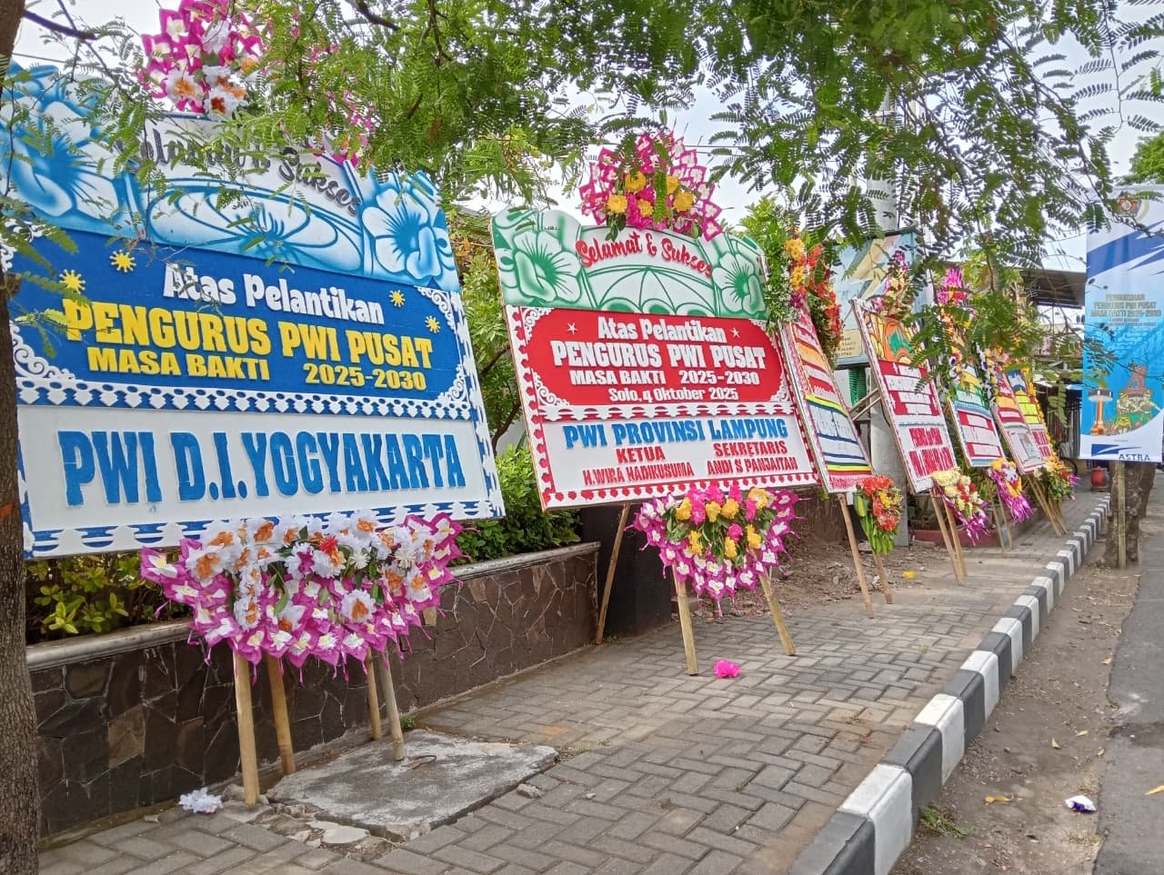 SOLO – Monumen Pers Solo, Jawa Tengah, menjadi saksi bisu pelantikan pengurus Persatuan Wartawan Indonesia (PWI) Pusat periode 2025-2030 yang berlangsung meriah pada Sabtu (4/10/2025). Ratusan karangan bunga dari berbagai tokoh nasional, pemerintah, hingga pihak swasta membanjiri lokasi acara, menambah semarak suasana.