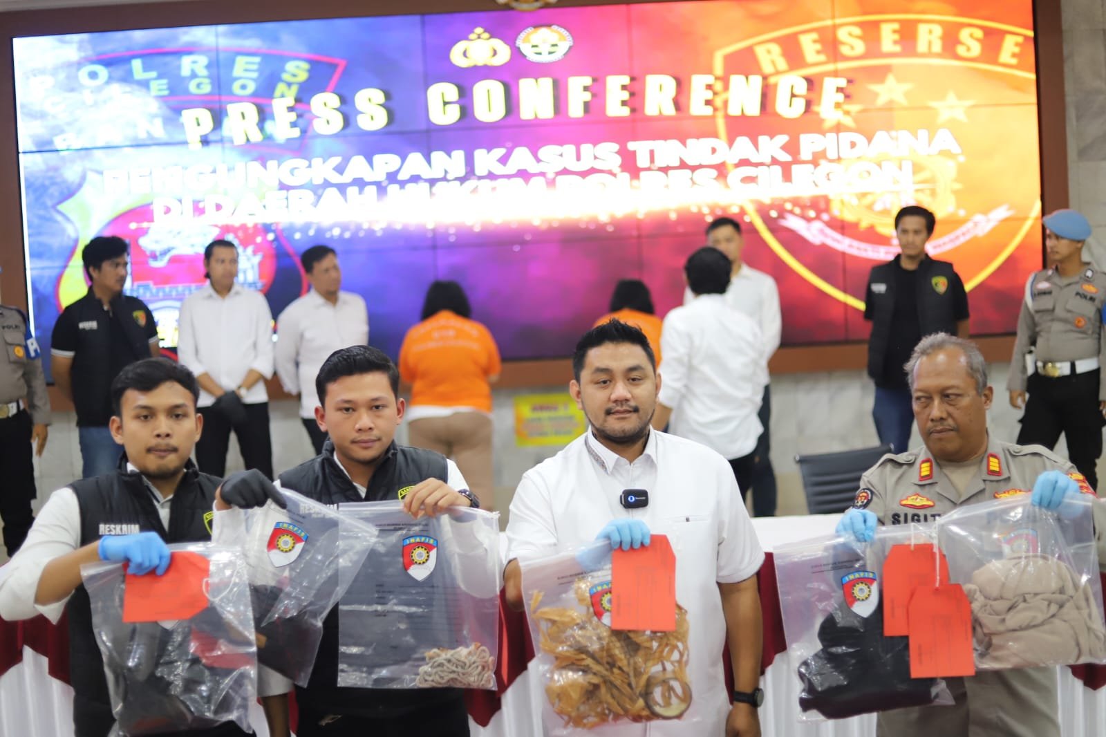 Barang bukti yang diamankan cukup signifikan, antara lain sobekan lakban coklat berambut, gulungan lakban utuh, tali kur pramuka putih, anting korban, pisau kecil, kursi plastik coklat, tas korban bercak darah, serta baju dan celana korban.