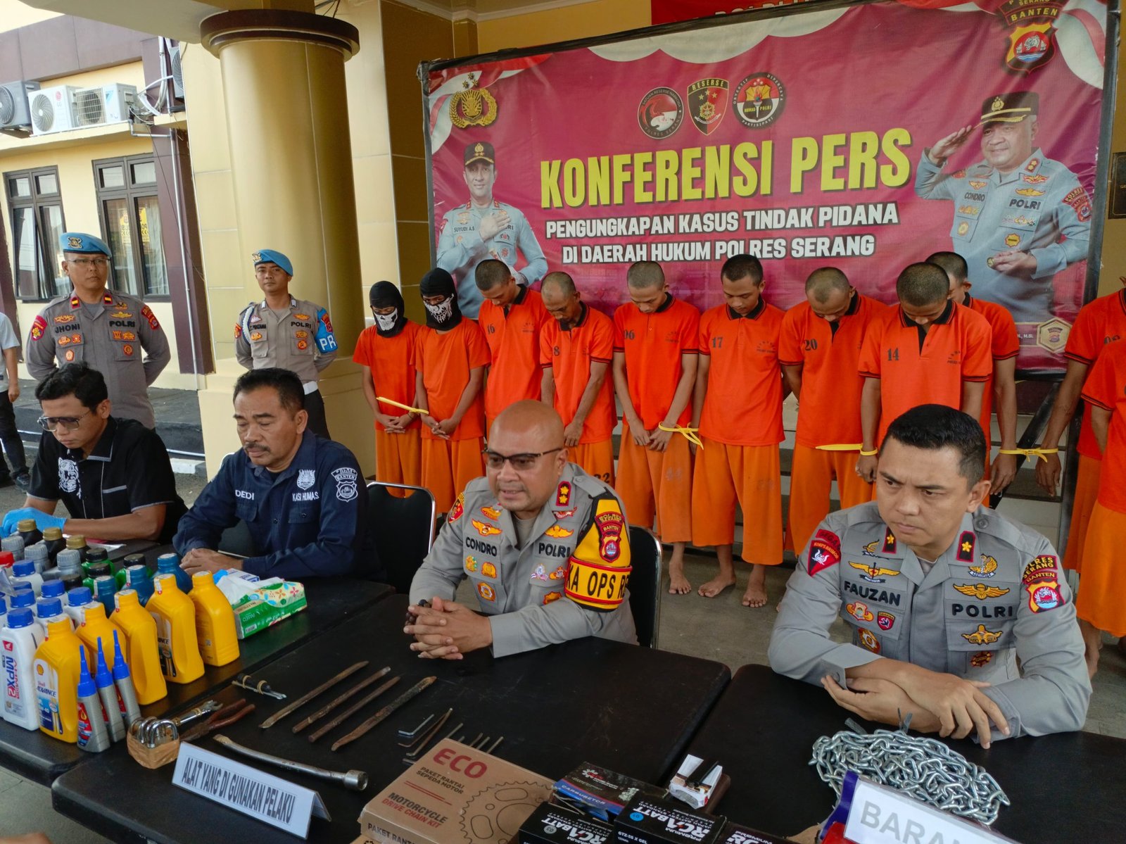Dua belas tersangka yang ditangkap adalah TLS (27), SUH (30), MAR (35), ROM (23), HAR (43), IJP (35), FA (22), IB (62), PA (16), ASS (15), TA (21), dan DH (24), semuanya warga Kabupaten Serang. Menarik perhatian, dua dari mereka masih di bawah umur.
