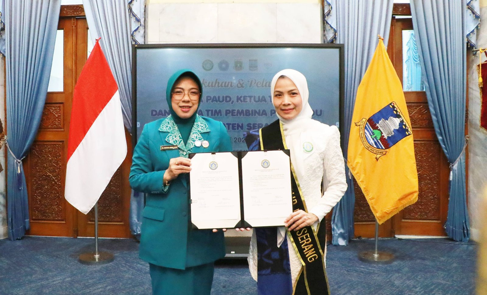 SERANG – Bupati Serang, Ratu Rachmatuzakiyah, resmi dilantik sebagai Bunda PAUD Kabupaten Serang periode 2025-2030. Pelantikan dilakukan oleh Bunda PAUD Provinsi Banten, Tinawati Andra Soni, di Pendopo Bupati Serang, Jumat (4/7/2025). Pelantikan ini berbarengan dengan pelantikan Tifa Hensifa Hanum Najib sebagai Ketua Tim Pembina Posyandu dan Ketua TP PKK Kabupaten Serang.