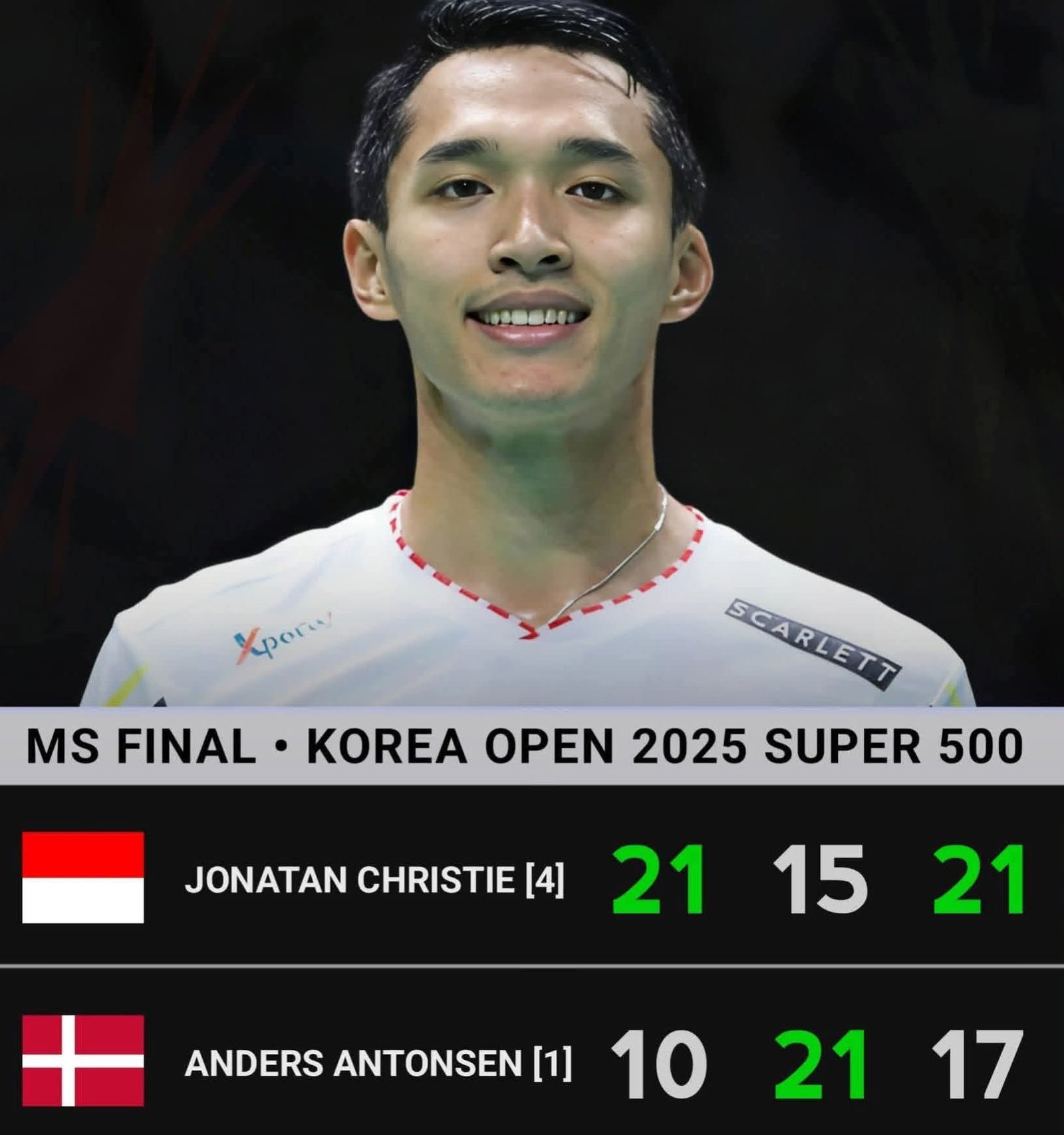 JAKARTA – Sorak sorai membahana di Suwon Gymnasium, Korea Selatan, saat Jonatan Christie memastikan dirinya sebagai kampiun Korea Open 2025! Minggu, 28 September 2025, menjadi hari tak terlupakan bagi pebulu tangkis tunggal putra Indonesia ini, yang berhasil menaklukkan Anders Antonsen dari Denmark dalam laga final yang mendebarkan. Kemenangan ini bukan sekadar soal angka, melainkan sebuah drama yang sarat emosi, perjuangan, dan air mata.
