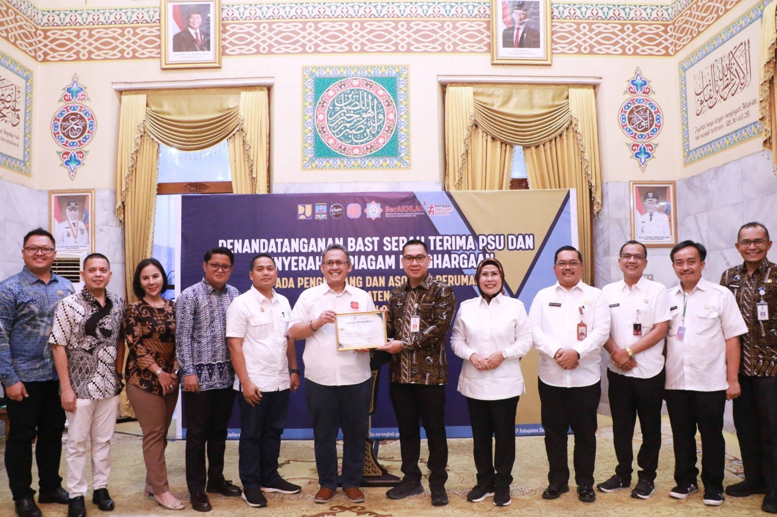 SERANG – Bupati Serang Ratu Tatu Chasanah melakukan penandatanganan BAST serah terima Prasarana Sarana Umum (PSU) perumahan bersama para pengembang di Pendopo Bupati pada Rabu, 6 November 2024. Selain itu, Bupati Serang juga memberikan penghargaan kepada pengembang, DPD Real Estat Indonesia (REI) Banten, dan DPD Asosiasi Pengembang Perumahan dan Permukiman Seluruh Indonesia (Apersi) Banten.