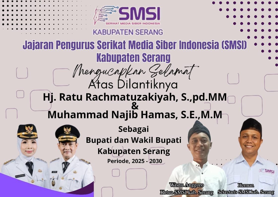 SERANG – Serikat Media Siber Indonesia (SMSI) Kabupaten Serang menyampaikan ucapan selamat dan sukses atas dilantiknya Hj. Ratu Rachmatuzakiyah, S.pd.MM sebagai Bupati dan Muhammad Najib Hamas, S.E., M.M sebagai Wakil Bupati Serang periode 2025-2030. Pelantikan yang berlangsung di Gedung Negara Pendopo Provinsi Banten ini disambut antusias oleh SMSI Kabupaten Serang yang siap berkolaborasi dalam memajukan Kabupaten Serang. Selasa, (27/05/2025).