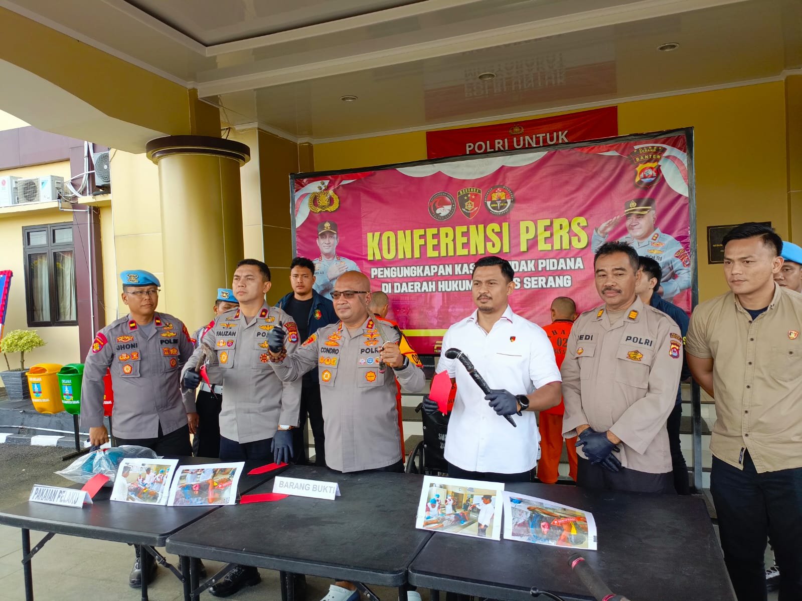 “Pelaku JR dan KA ditangkap di Pejagalan, Jakarta Utara. Satu pelaku terpaksa ditembak karena melawan saat diminta menunjukkan lokasi persembunyian SA di Carenang,” jelas Kapolres Serang, AKBP Condro Sasongko, dalam konferensi pers di Mapolres Serang, Senin (30/6). Ia didampingi Wakapolres Kompol Fauzan Afifi, Kasatreskrim AKP Andi Kurniady ES, dan Kanit Pidum Ipda Hendri.